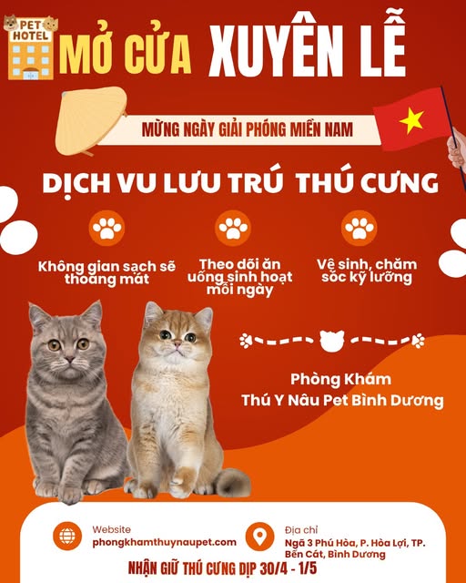 Nhận giữ thú cưng 30/4 tại Bến Cát – Giải pháp an tâm cho kỳ nghỉ lễ của bạn tại Phòng Khám Thú Y Nâu Pet Bình Dương